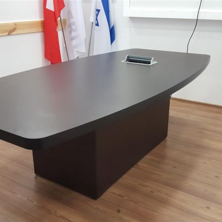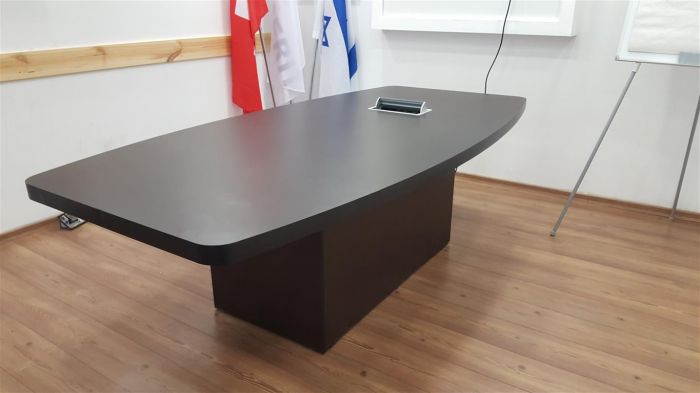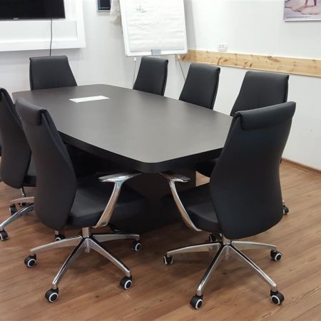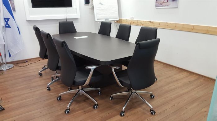 שולחן מפואר לחדר ישיבות עובי פלטה 5.6 ס"מ כולל קופסת תקשורת AXIAK 5 כולל 8 כסאות איכותיים לחדר ישיבות מדגם מיטינג